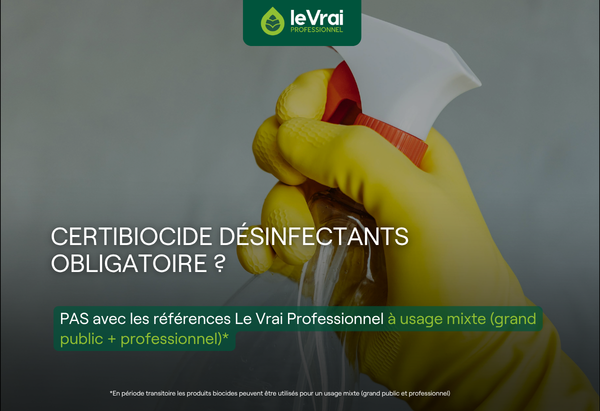 Depuis le 1er janvier 2026, toute personne achetant, vendant ou utilisant des produits biocides destinés exclusivement aux professionnels (types TP2, 3 et 4) doit être titulaire du certibiocide désinfectants. Une exigence réglementaire qui impacte l'ensemble des acteurs de la filière hygiène. Bonne nouvelle: une large gamme de produits Le Vrai Professionnel n'est pas concernée par cette obligation.