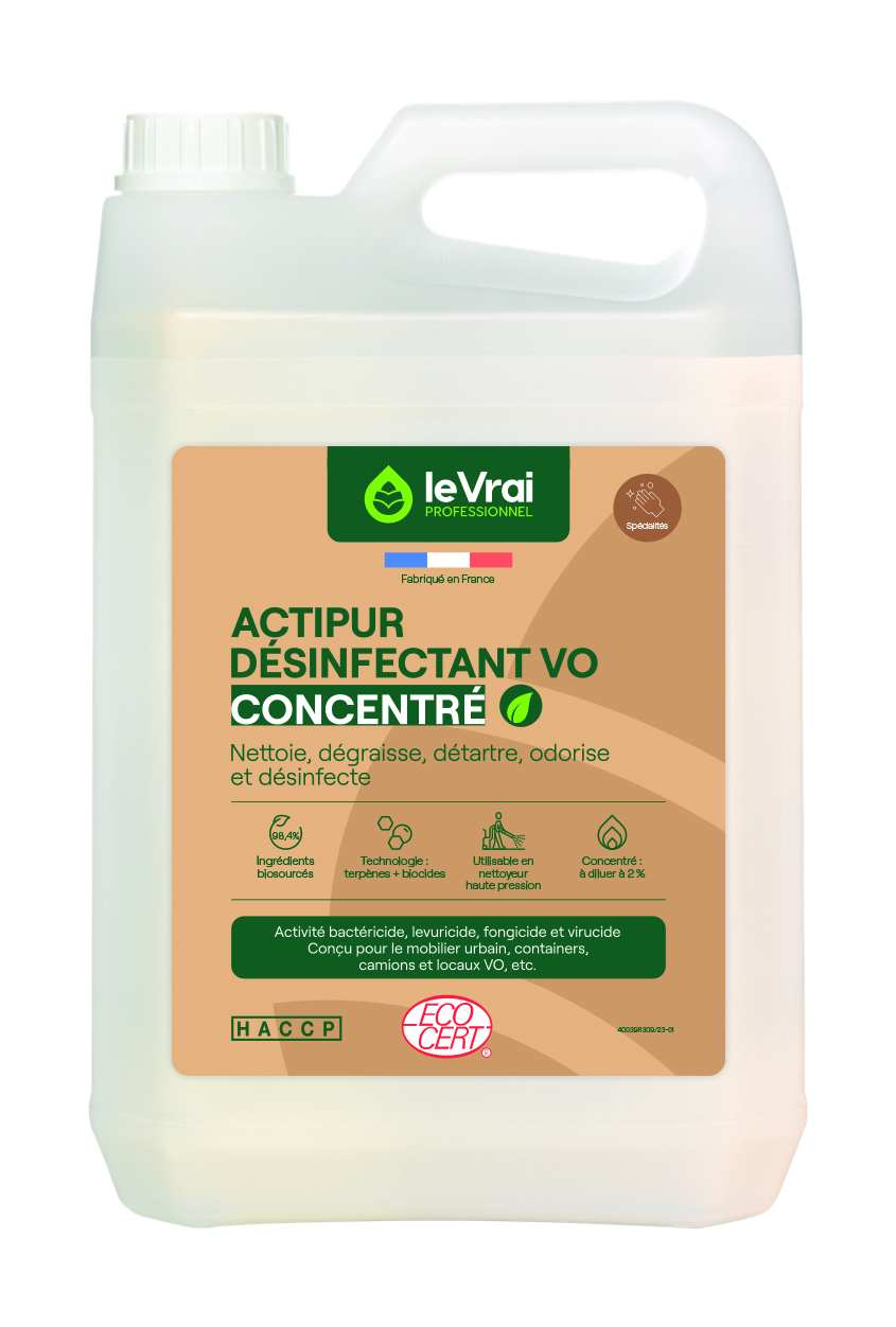 Le Vrai Professionnel Actipur Désinfectant VO est idéal pour le nettoyage et la désinfection des mobiliers urbains, des aires de jeux, des rampes et cages d’escaliers des parkings, des WC publics, des containers et locaux vide-ordures, etc.