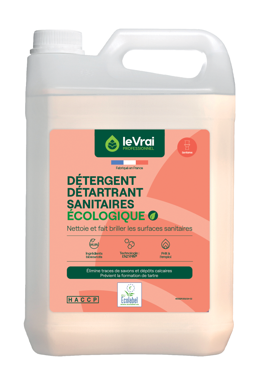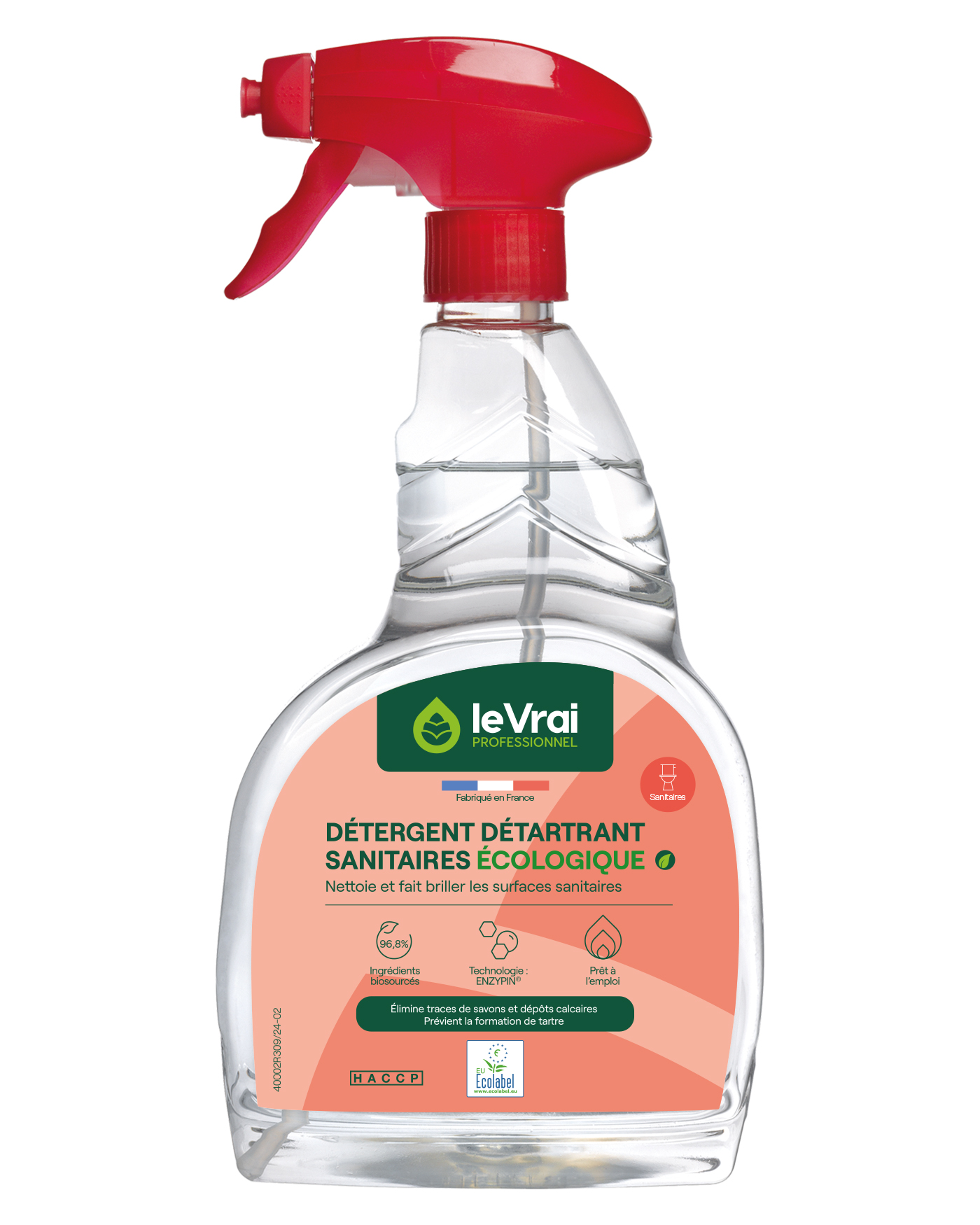 Le Vrai Professionnel Détergent Détartrant Sanitaires Ecologique nettoie les surfaces sanitaires et les débarrasse des résidus calcaires.