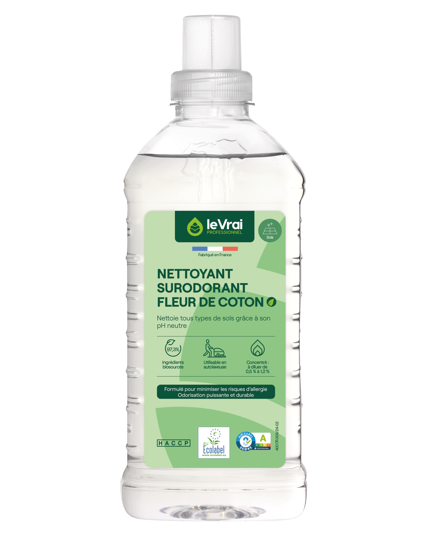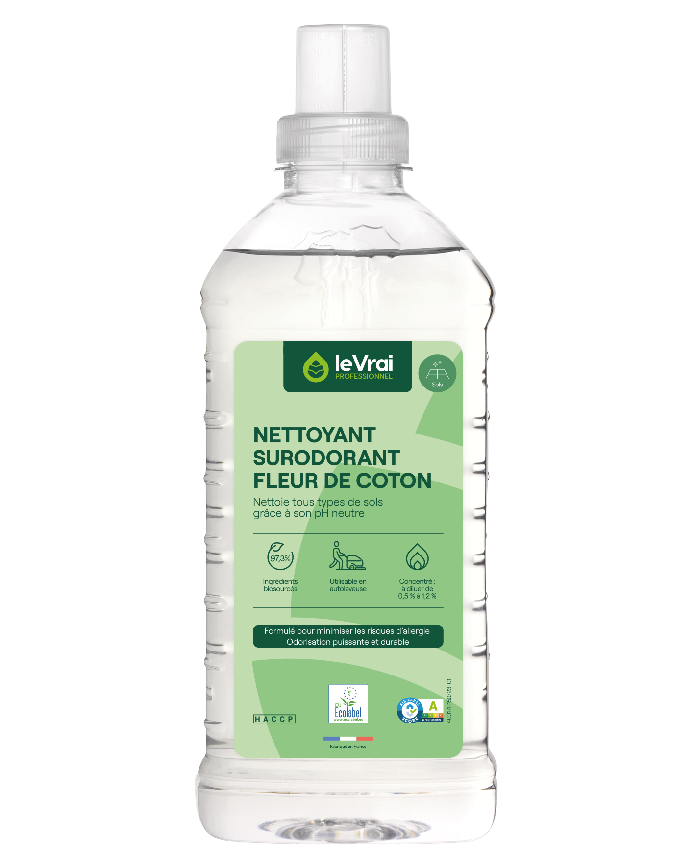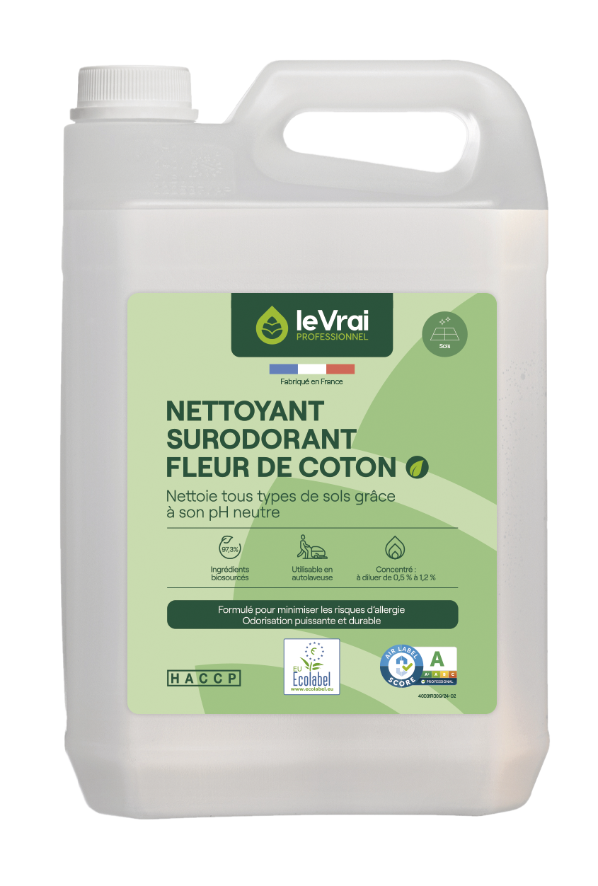 Le Vrai Professionnel Nettoyant Surodorant Fleur de Coton est un détergent parfumant longue durée pour tous les types de sols en milieux collectifs (secteurs tertiaires, scolaires, paramédicaux, restauration et hôtellerie, parties communes d’immeubles).