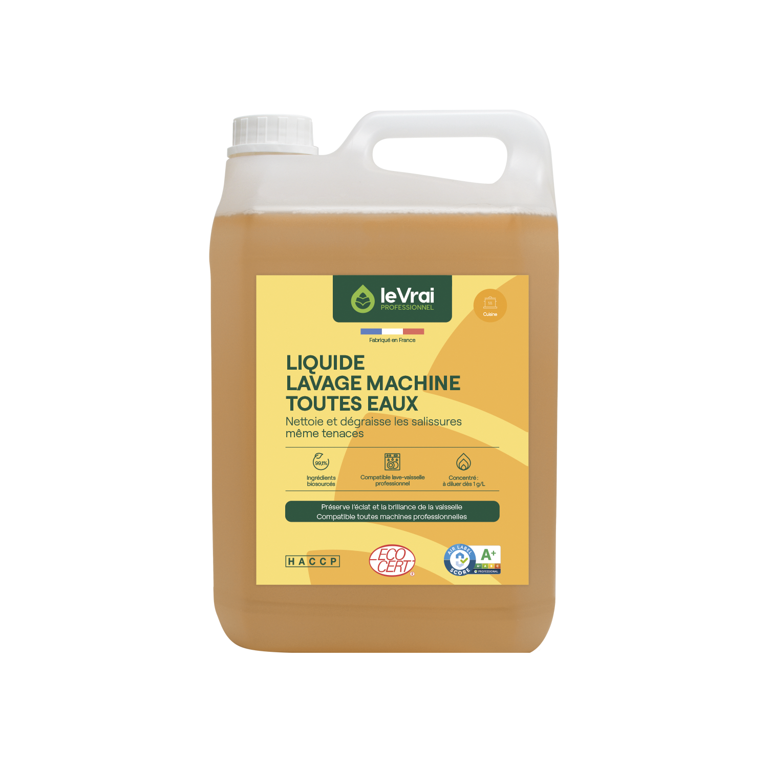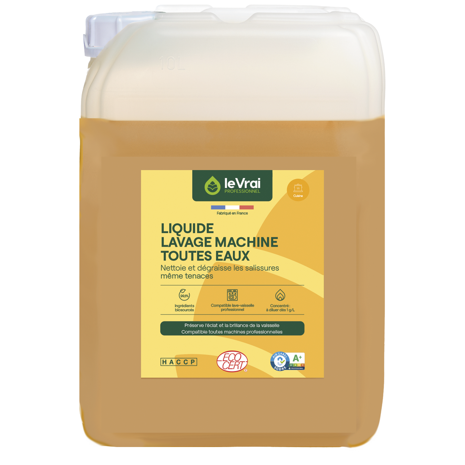 Pour améliorer la durabilité de votre appareillage, un dérochage est conseillé mais non obligatoire. À utiliser avec un doseur automatique réglé en fonction du degré de salissures et de la dureté de l’eau. Pour une efficacité optimale, utiliser avec le Liquide Rinçage Machine Toutes Eaux Le Vrai Professionnel.