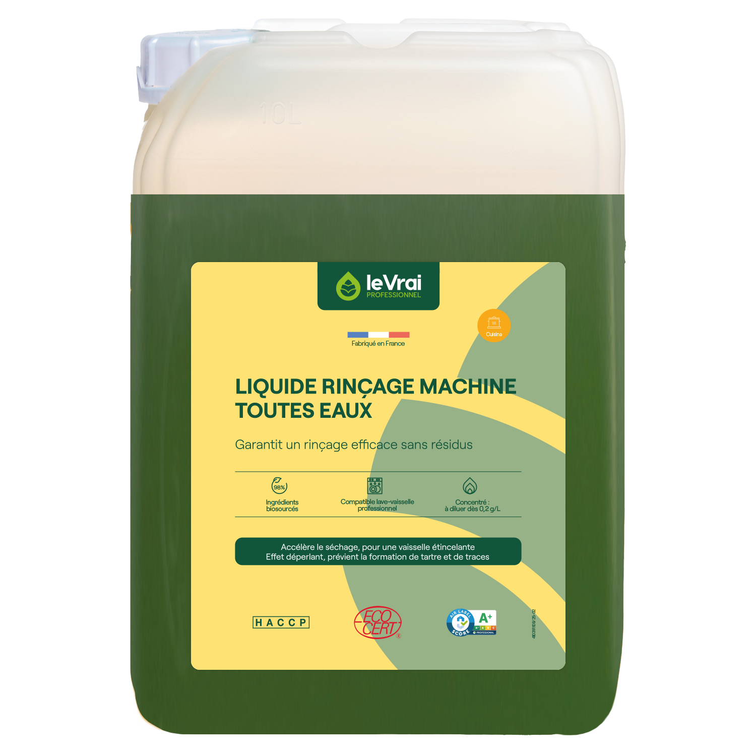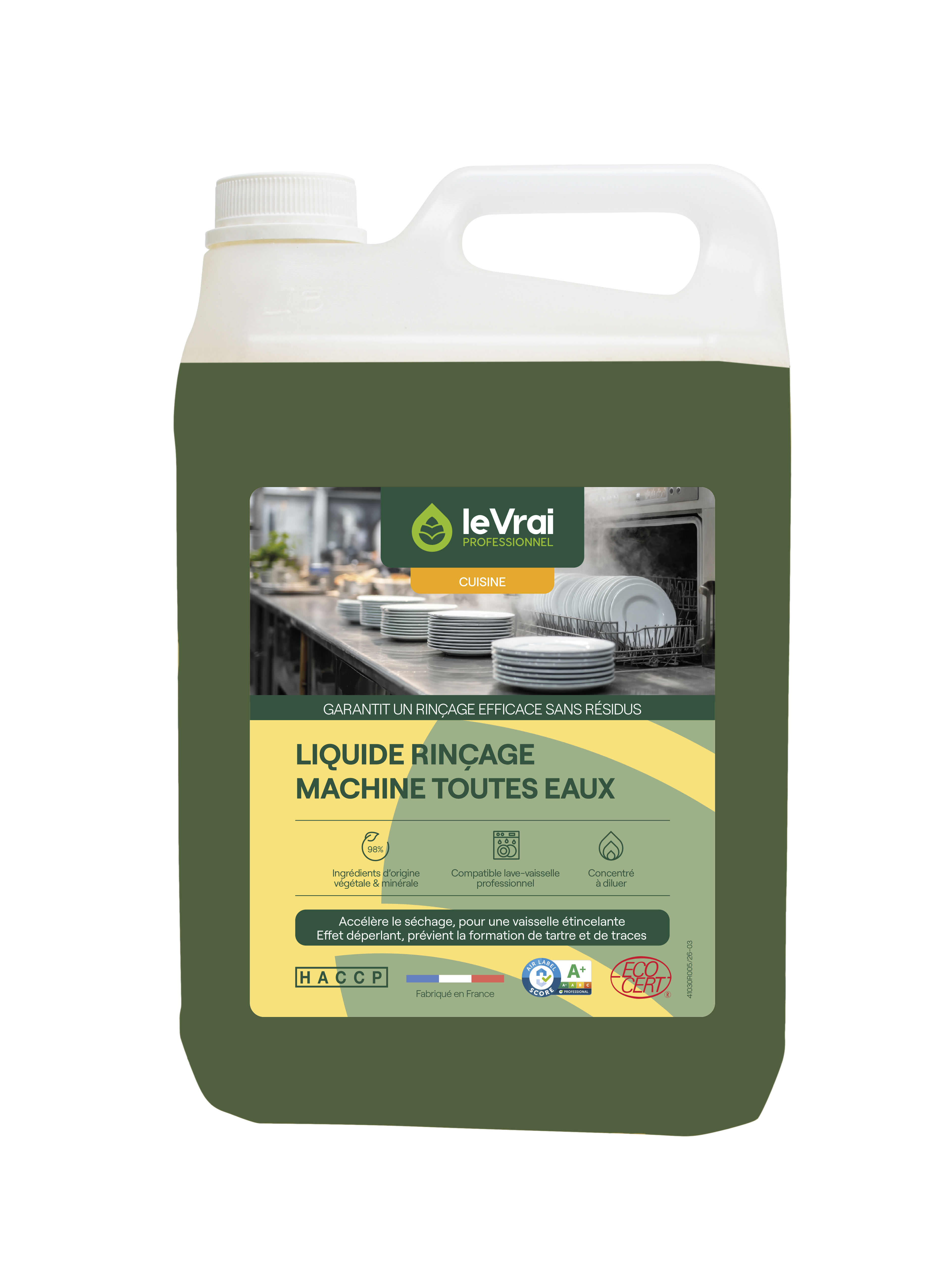 Pour améliorer la durabilité de votre apparareillage, un dérochage est conseillé mais non obligatoire. À utiliser avec un doseur automatique réglé en fonction de la dureté de l’eau. Pour une efficacité optimale, utiliser avec le Liquide Lavage Machine Toutes Eaux Le Vrai Professionnel.